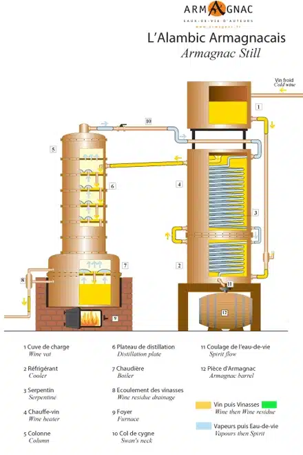 La distillation à l’armagnacaise repose sur un alambic traditionnel à colonne, adopté au 19ème siècle dans la région, et connu sous le nom d' »alambic armagnacais ». Cet alambic en cuivre est muni d’un foyer, une chaudière, une colonne, et un chauffe-vin. Le processus de distillation à l’armagnacaise se distingue par son approche de distillation continue, permettant d’obtenir une eau-de-vie riche en arômes suite aux échanges permanents aillant lieu entre le vin et les vapeurs chargées en alcool dans les colonnes.
